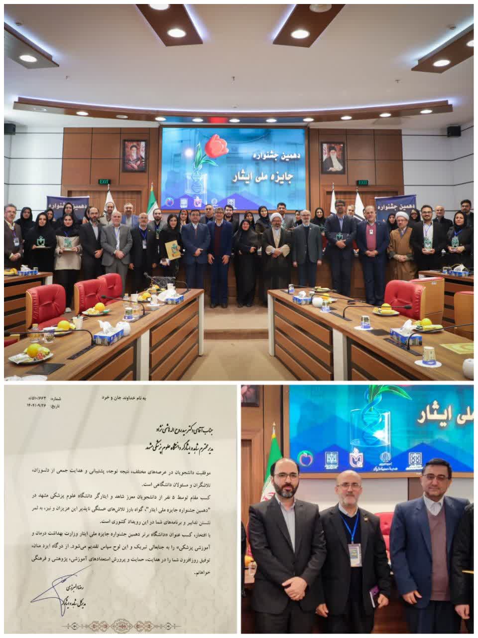 لازم به ذکر است،دهمین جشنواره ملی جایزه ایثار با هدف تجلیل از نخبگان علمی و فرهنگی جامعه ایثارگری، به میزبانی دانشگاه علوم پزشکی تهران برگزار شد که دانشگاه علوم پزشکی مشهد با حضور مؤثر خود و معرفی چندین دانشجوی برگزیده، موفق به کسب جایگاه برتر در این جشنواره شد. در این مراسم، دکتر سید روحالله هاشمینژاد، مدیر امور شاهد و ایثارگر دانشگاه، به همراه جمعی از دانشجویان منتخب حضور داشتند و از سوی مدیرکل امور شاهد و ایثارگر وزارت بهداشت مورد تقدیر قرار گرفتند.