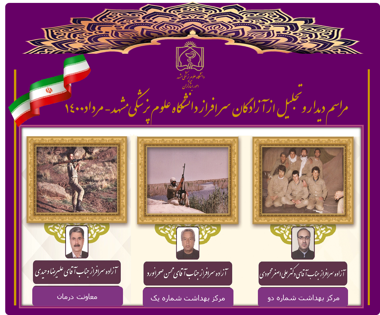 در این مراسم که با حضور دکتر محرری معاون دانشجوئی و فرهنگی، دکتر هاشمی نژاد مشاور رئیس دانشگاه در امور ایثارگران، دکتر فرهمند قائم مقام معاونت بهداشتی و دکتر اسماعیل زاده مدیر امور فرهنگی دانشگاه برگزار شد از سه آزاده ی معزز شاغل در دانشگاه تجلیل به عمل آمد.
