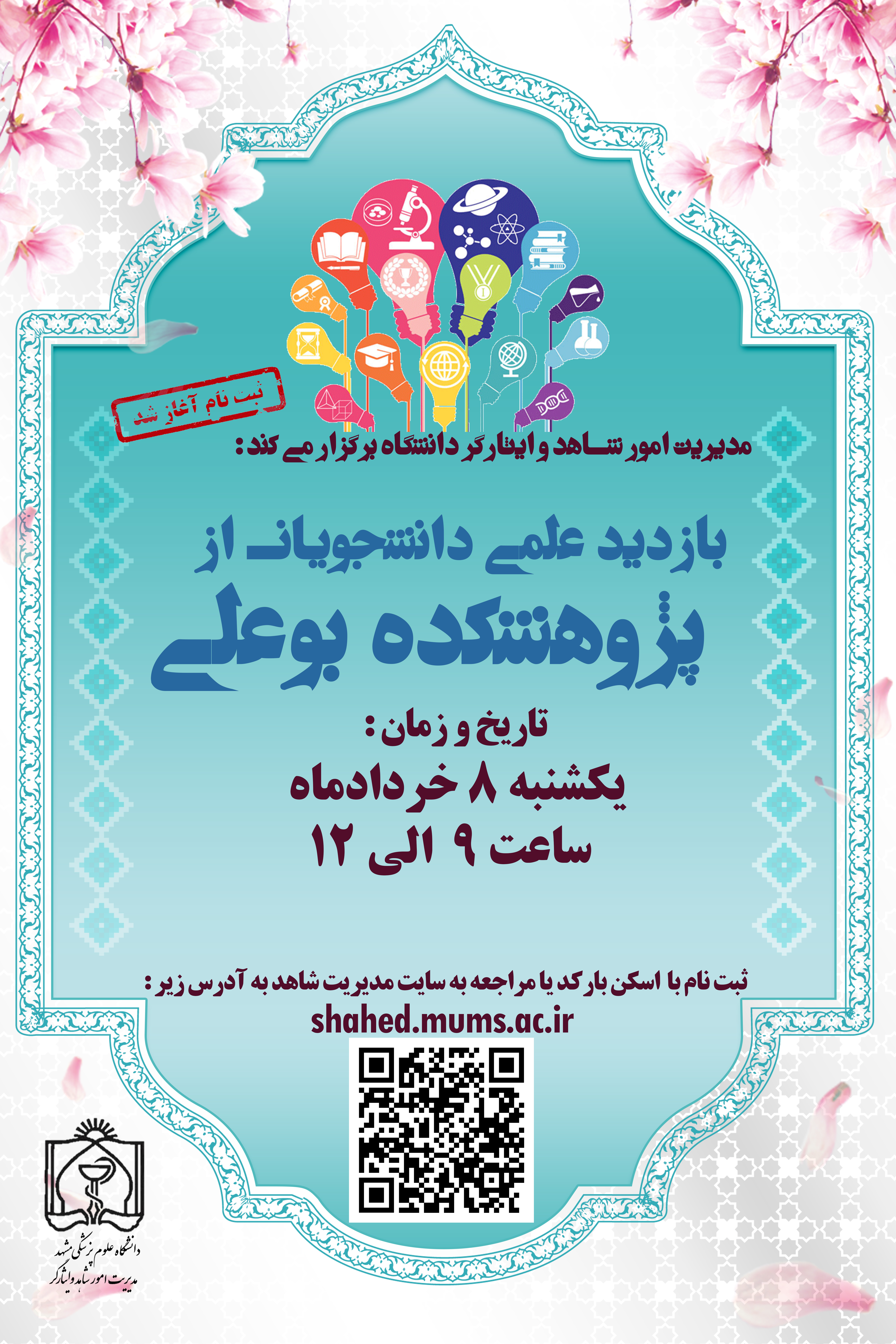 مدیریت امور شاهد و ایثارگران دانشگاه در نظر دارد برنامه ی بازدید علمی از پژوهشگاه بوعلی را در راستای تحقق شعار سال مبتنی بر "تولید، دانش بنیان و اشتغال آفرین" و با هدف تعامل و پیوند بین دانشجویان و محققان و آگاهی از ظرفیت ها و پتانسیل های دانشگاه جهت دانشجویان شاهد و ایثارگر علاقه مند به موضوعات کار آفرینی و امور پژوهشی و تحقیقاتی؛ برگزار نماید.
