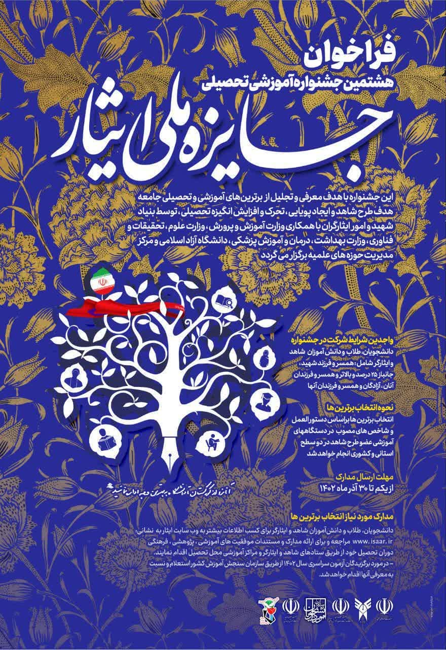 این جشنواره هرساله به منظور شناسایی، معرفی و تقدیر از دانشجویان مستعد شاهد و ایثارگر در محورهای ایثارگری، آموزشی، پژوهشی و فرهنگی برگزار میشود افزود: واجدین شرایط شرکت در جشنواره، دانشجویان کارشناسی، کارشناسی ارشد، دکترای تخصصی (phd) با حداقل معدل کل 17 و دکترای حرفه ای( پزشکی عمومی، دندانپزشکی و داروسازی) با حداقل معدل کل 16 و تخصص با گواهی قبولی آخرین آزمون ارتقاء بالاتر می باشند.