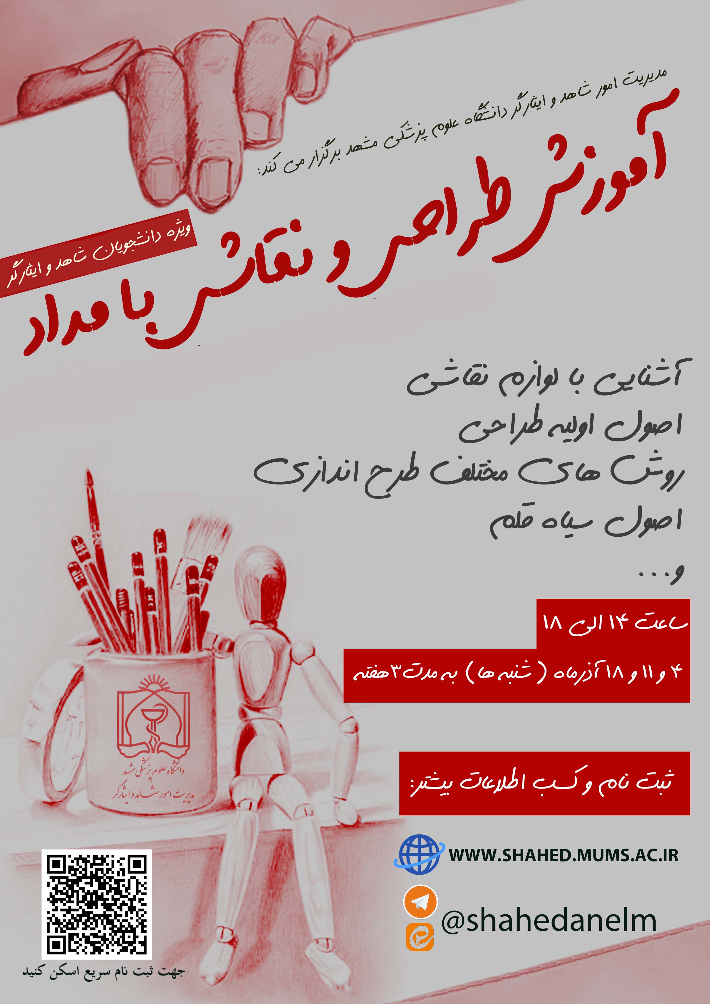 در این دوره که در قالب سه کارگاه 4 ساعته در تاریخ های 4، 11 و 18 آذرماه جاری برگزار شد، تکنیک های مختلف طرح اندازی با قلم برای مخاطبین آموزش داده شد.این تکنیک ها شامل تناسب، چشمی، کاربنی، شطرنجی و اسکیس بودند که با تمرین روی اجزای مختلف صورت آموزش و مورد تمرین بین مخاطبان قرار گرفت.