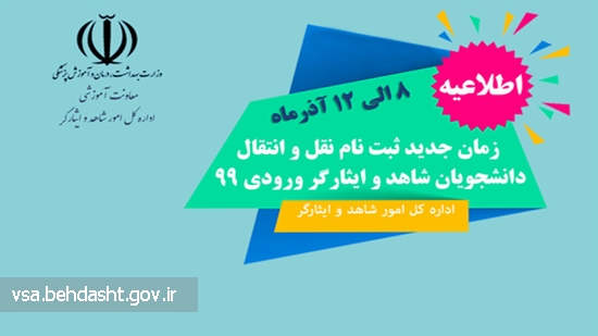 بنا به گزارش پایگاه اطلاع رسانی اداره کل امور انشجویان شاهد و ایثارگر وزارت بهداشت ، درمان و آموززش پزشکی، زمان جدید ثبت «نقل و انتقال دانشجویان شاهد و ایثارگر» ورودی 99، در روزهای 8 الی 12 آذر ماه 99 تعیین شد.