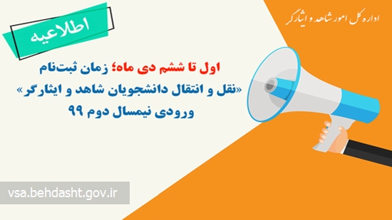 بنا به اعلام پایگاه اطلاع رسانی اداره کل امور دانشجویان شاهد و ایثارگر؛ زمان ثبت نام «نقل و انتقال دانشجویان شاهد و ایثارگر» ورودی نیم سال دوم 99، در روزهای دوشنبه اول دی ماه الی شنبه 6 دی ماه 99 تعیین شد.
